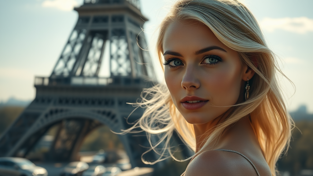 Ultra realistic 4k cinematic masterpiece of a stunning blonde woman with captivating features positioned in front of the Eiffel Tower, showcasing extreme detail and focus, a gentle breeze accentuates her natural elegance as soft sunlight casts a warm glow, highlighting the intricate play of shadows and textures in the scene.