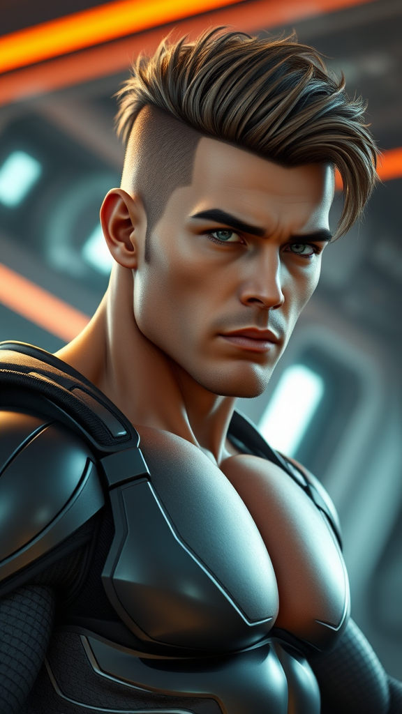 Ultra-realistic 8k render, dynamic lighting with ambient occlusion, featuring a powerful hero in a science fiction setting. The scene captures a full-body portrait of a man with intricate and detailed hair. His smooth, flawless skin highlights his powerful physique, dressed in meticulously detailed, realistic clothing that complements the futuristic theme. Colors are vivid and engaging, enhancing the lifelike quality of the character. The overall composition blends Octane render quality with extraordinary detail, focusing on portraying a heroic figure with enhanced realism and depth.