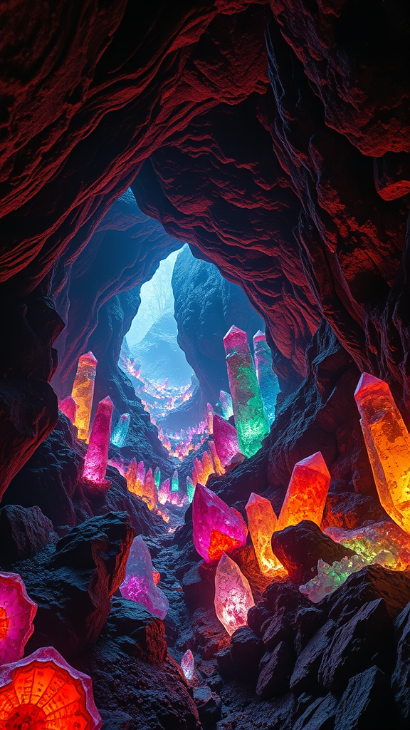 Ultra realistic and highly detailed digital illustration of a panoramic view in a mysterious underground cavern filled with massive, colorful crystal formations. The scene captures vibrant and vivid hues reflecting off the smooth surfaces of crystals, gems, and geodes within the darkness. Rich mineral deposits catch the eye, enhanced by cinematic lighting, high contrast, and HDR quality. The setting conveys a magical and hyperrealistic atmosphere, with a subtle bokeh effect adding to the depth of field. Inspired by the styles of Greg Rutkowski and Kinkade, the image evokes wonder and enchantment. Despite its detail, the overall atmosphere remains clear and focused without any visual artifacts or distortions.