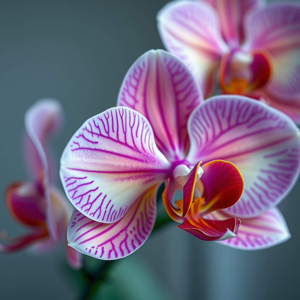 Ultra-realistic capture of a vibrant orchid, displaying intricate petal textures and vivid colors, reminiscent of high-end nature photography, taken with a Sony A7 III camera. The composition emphasizes the orchid's natural elegance and details, set against a softly blurred background to enhance depth, arranged in a tall 1:2 aspect ratio with a creative flair for stunning visual appeal.
