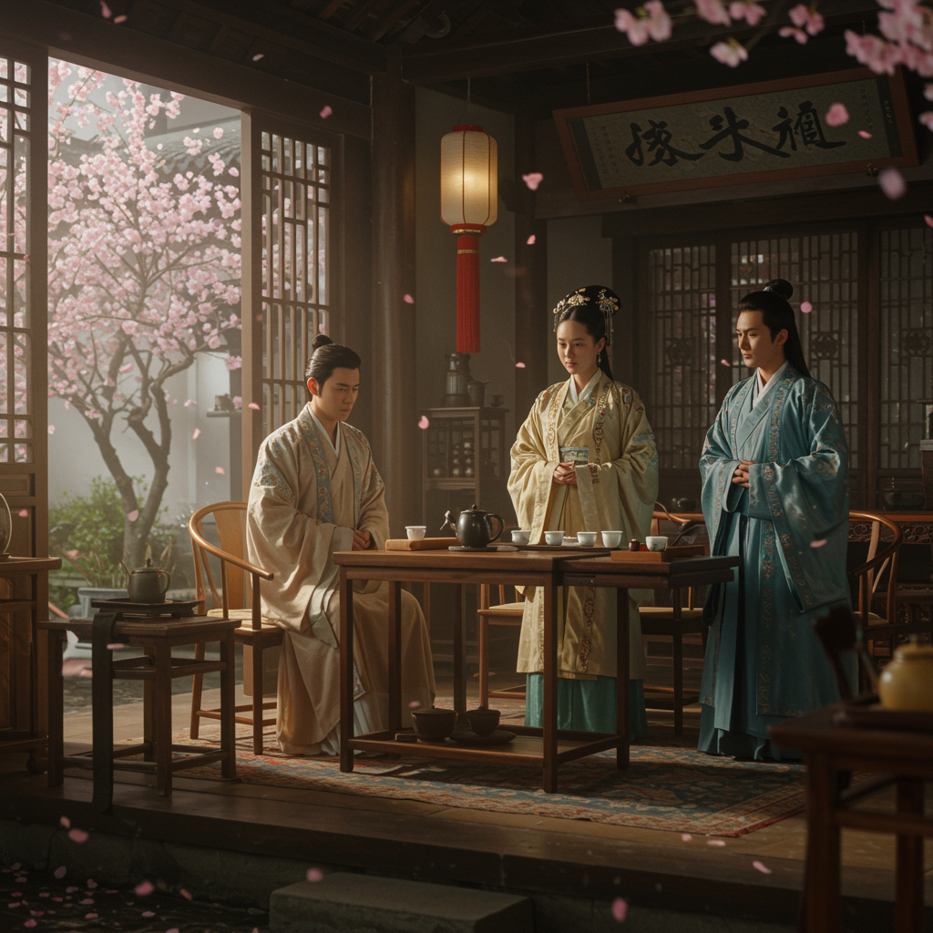 Ultra-realistic, cinematic 8k scene of a traditional Chinese teahouse, capturing the intricate details and vibrant ambiance of the setting. The scene showcases individuals in exquisite Asian national dress, highlighting the elegance of their attire. The teahouse is bathed in warm, natural light, with delicate teapots and ornate wooden furniture adding to the authenticity. The image is framed in an ar16:9 aspect ratio, emphasizing the harmonious blend of tradition and tranquility, while small, subtle creative elements, such as cherry blossom petals drifting gently by, add a unique touch to the serene atmosphere.