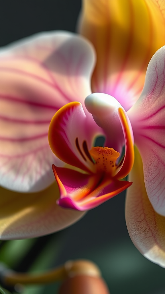 Ultra-realistic close-up of a vibrant orchid, capturing its delicate petals in exquisite detail, in the style of high-definition nature photography, shot on a Sony A7R III, with a focus on natural light and a slightly dewy texture, with an aspect ratio of 1:2. Use soft, diffused lighting to highlight the blossom's intricate patterns and subtle color gradients, stylize 750 --v 6.1.