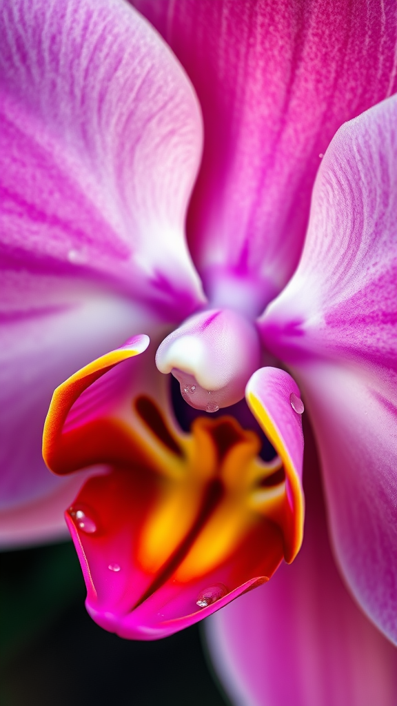 Ultra-realistic close-up of a vibrant orchid, in the style of high-definition nature photography, captured with a Sony A7 III, showcasing intricate details and rich textures --ar 1:2 --stylize 750 --v 6.1. Subtle play of light and shadow highlights the delicate petals, while dew drops glisten like tiny jewels. Vivid colors blend seamlessly, creating a breathtaking portrait of natural beauty.