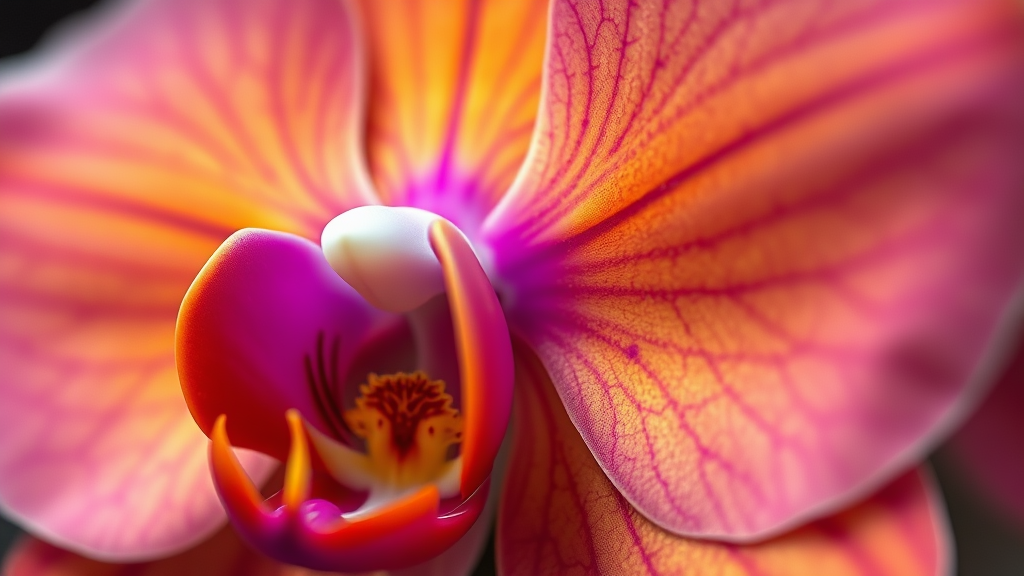 Ultra-realistic close-up of a vibrant orchid, showcasing its delicate textures and rich colors in the style of high-definition nature photography. Captured with a Sony A7 III, emphasizing intricate details with a 1:2 aspect ratio, enhanced by subtle artistic elements to create an ethereal and captivating image.