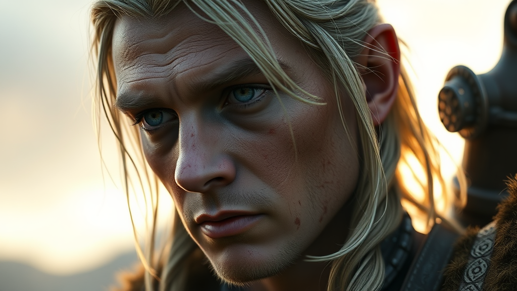 Ultra-realistic close-up portrait of a weary Legolas from The Lord of the Rings, illuminated by the soft glow of a pale sunrise. The cinematic lighting casts dramatic shadows on his battle-worn face, captured from a low angle. This trending artwork on ArtStation is rendered in stunning 4k resolution, showcasing hyper-realistic textures and extreme details powered by Unreal Engine 5. The composition is a cinematic masterpiece, with every element focused to create a lifelike representation of the Elven warrior in the midst of an epic landscape.