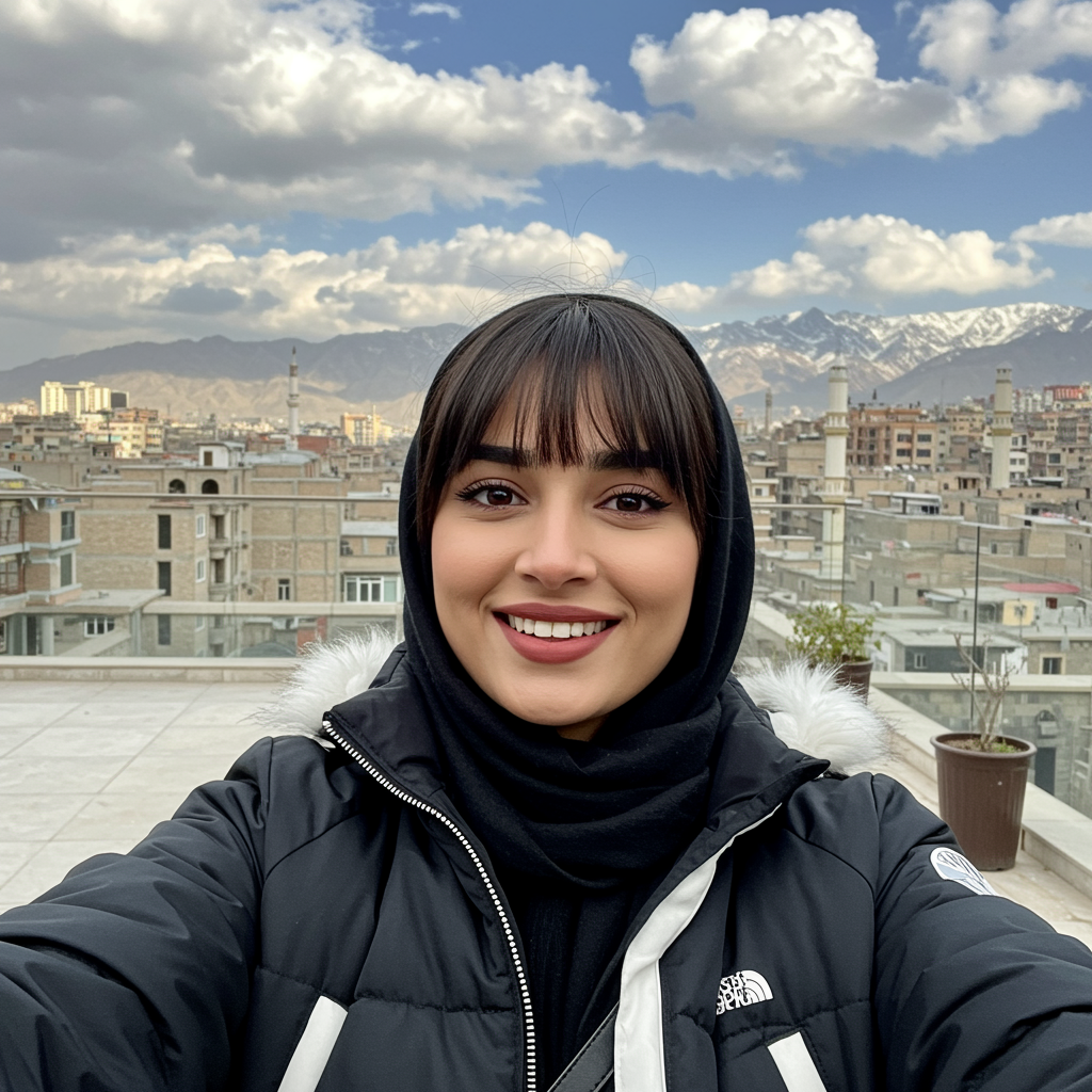 Ultra-realistic, close-up selfie from a low angle of a 22-year-old woman with a stylish bangs hairstyle, wearing a chic, contemporary Muslim winter jacket in shades of dark and white. She poses confidently on a luxurious rooftop in Kabul, Afghanistan, the cityscape visible behind her, under a sky dotted with fluffy clouds. Her expression is joyful, with a bright smile that reflects the vibrant yet serene ambiance.