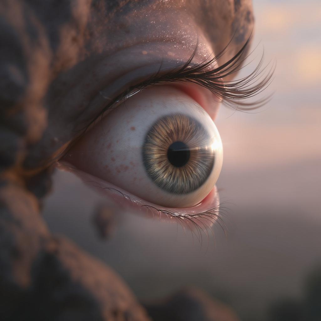 Ultra realistic depiction of a floating eyeball outside its socket, surrounded by an ethereal glow, as the first light of dawn bathes the scene in a soft, pale hue. The cinematic lighting accentuates the weathered texture and subtle imperfections of the eyeball, casting dramatic shadows that add depth and intrigue. Captured from a low angle, the composition gives a sense of grandiose scale, bringing the viewer into an intimate encounter with this singular vision. The intricate and hyper detailed rendering harnesses the power of Unreal Engine 5, achieving a 4k masterpiece that blurs the line between reality and artistry. Echoes of Studio Ghibli's whimsical essence and the atmospheric brilliance of John William Turner imbue the scene with a sense of wonder and mystique, resulting in a trending art piece that captivates with its extraordinary realism and imagination.