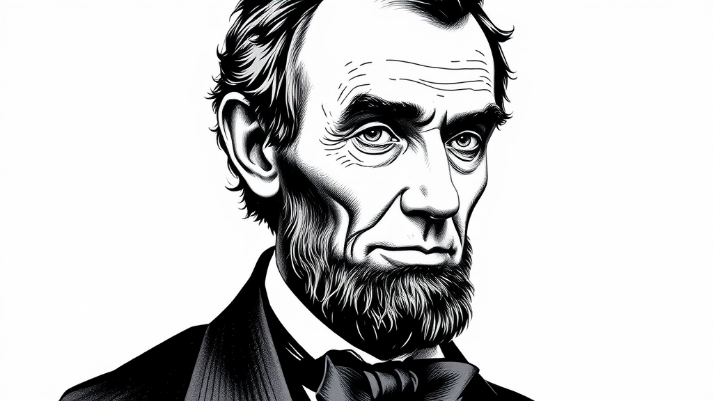 Ultra-realistic depiction, ink illustration, Abraham Lincoln headshot isolated against a plain white backdrop with subtle artistic variations capturing his essence.