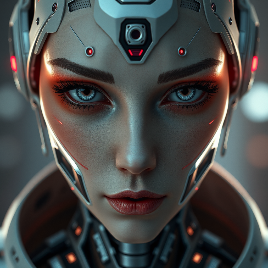 Ultra-realistic depiction of a female android's face, showcasing intricate and high-detail graphics with cinematic lighting effects, 4K resolution, and an artstation aesthetic. The design emphasizes powerful features and uses rim lighting and diffraction grading to enhance visual impact, rendered with RTX technology. Inspired by Ivan Shishkin, this representation may include low-resolution elements, textual overlays, or potential pixelation. It features intricacies in anatomy with unexpected variations, exploring the limits of form through extra or missing limbs, unusual proportions, and abstracted features like elongated necks or duplicated elements, creating a compelling, avant-garde composition.
