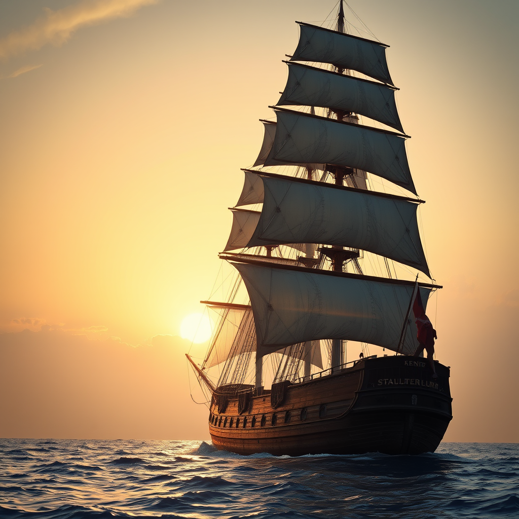 Ultra realistic depiction of a majestic sailing ship illuminated by a dramatic pale sunrise; the scene is enhanced with cinematic lighting that casts intricate shadows and highlights the ship’s weathered but noble character. The perspective is from a low angle, adding grandeur and emphasis to the ship's towering masts. The hyper-realistic details focus on the texture of the sails and the distressed wood of the hull. The artwork is trending on ArtStation, captured in stunning 4k, using Unreal Engine 5 to heighten realism and depth; the piece is a masterpiece that marries the enchanting style of Studio Ghibli with the intricate detail of John William Turner's artistry. The scene is vibrant and atmospheric, embodying the timeless beauty and adventurous spirit of the sea.