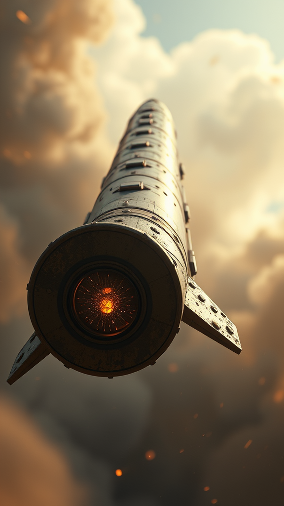 Ultra realistic depiction of a missile in motion, glowing brilliantly in cinematic lighting, rugged and weathered, captured from a low angle, gaining popularity on art platforms, 8k ultra HD clarity, hyper-realistic with intense focus and intricate details, rendered in Unreal Engine 5, a cinematic masterpiece, resembling a fusion of Studio Ghibli's art style and the intricate brushwork of J.M.W. Turner, evolving into a unique and breathtaking visual.