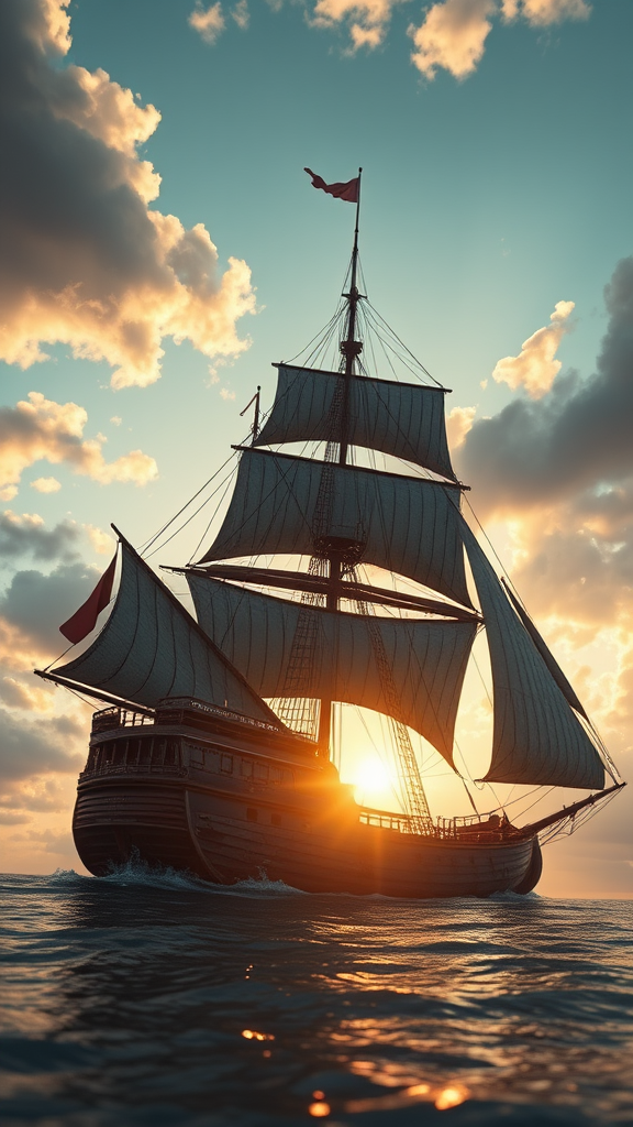 Ultra-realistic depiction of a weathered sailing ship under dramatic skies, with the soft glow of a pale sunrise casting cinematic light across its rugged sails, captured from a low angle in 4K resolution. The hyper-realistic scene showcases intricate details in a masterpiece blend inspired by Studio Ghibli's narrative depth and the evocative brushwork of John William Turner. Rendered with Unreal Engine 5, this artwork exudes a timeless quality, trending on art platforms, featuring a focused composition where every element contributes to an epic, cinematic atmosphere.