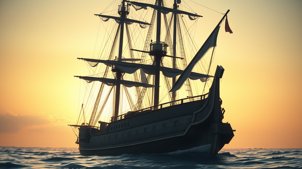 Ultra realistic depiction of a weathered sailing ship, captured in the ethereal glow of a pale sunrise with dramatic, cinematic lighting. The vessel, appearing worn and battered by the elements, is presented from a low angle to emphasize its grandeur. Hyper realistic and focused, the scene captures extreme details, reminiscent of art trending on ArtStation. Crafted in 4k resolution with the precision of Unreal Engine 5, this masterpiece draws inspiration from the intricate techniques of John William Turner and the enchanting style of Studio Ghibli. The artwork envelops viewers in an extraordinary visual experience, blending classical artistry with modern digital mastery.