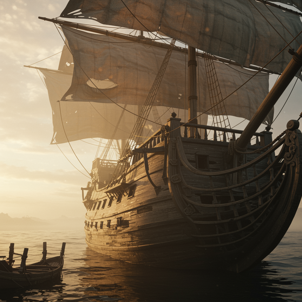 Ultra-realistic depiction of a weathered sailing ship under the ethereal glow of a pale sunrise, captured with dramatic, cinematic lighting. The scene, seen from a low angle, highlights the ship's intricate details and age-worn texture. Rendered in 4k resolution, the hyper-realistic imagery channels the artistic finesse of Studio Ghibli and the masterful touch of John William Turner. The composition, enhanced by Unreal Engine 5, evokes a sense of timeless adventure, presenting a cinematic masterpiece with trending appeal among digital art connoisseurs.