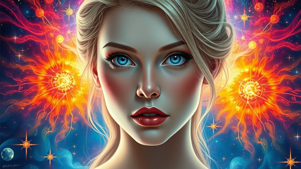 Ultra realistic digital painting of Scarlett Leithold with cosmic energy, vibrant colors bursting around her, featuring a beautifully symmetrical face and a calm, kind expression; realistic round eyes with a captivating gaze. The artwork is intricately detailed and elegantly designed, highlighting the smooth and sharp focus of the concept art. It evokes a dreamy, magical atmosphere, merging the artistic influences of Artgerm, Greg Rutkowski, and Alphonse Mucha, with subtle artistic flourishes adding a unique charm to the overall composition.