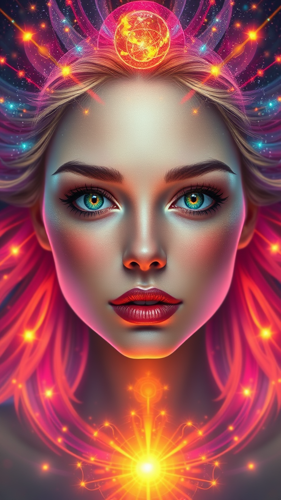 Ultra realistic digital painting of Scarlett Leithold embodying cosmic energy, featuring vibrant, colorful bursts around a beautifully symmetrical face. Her expression is one of gentle serenity, with realistic, round eyes exuding a nonchalant kindness. The piece is tone mapped and intricately detailed, capturing an elegant atmosphere. Influenced by the artistic styles of Artgerm, Greg Rutkowski, and Alphonse Mucha, the illustration showcases sharp focus and smooth transitions, enveloped in a dreamy, magical aura. Rendered in 4k and 8k for stunning clarity, it's a masterpiece of concept art and digital creativity.