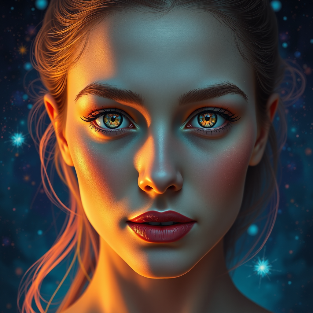 Ultra-realistic digital painting portrait of Scarlett Leithold infused with cosmic energy, vibrant colors bursting like a cosmic painting, displaying a beautifully symmetrical face with a serene, kind expression. Her realistic round eyes exude warmth, rendered in a tone-mapped style that highlights intricate elegance. The artwork is highly detailed, inspired by concept art from ArtStation, featuring smooth, sharp focus. The dreamy, magical atmosphere echoes the artistic influences of Artgerm, Greg Rutkowski, and Alphonse Mucha, with subtle, creative modifications that enhance the enchanting essence of the composition.