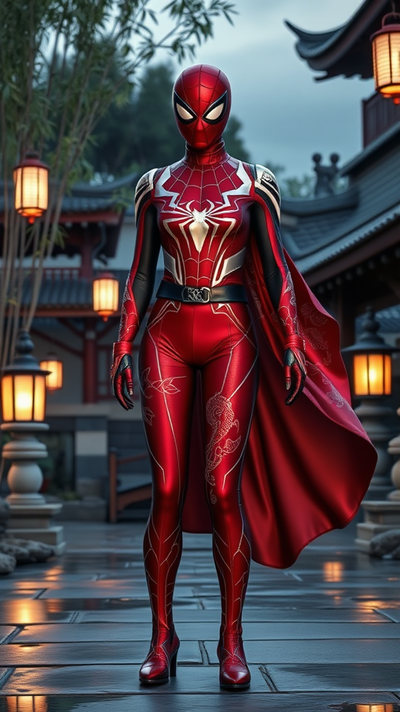Ultra-realistic female Spider-Woman, full-body view, photorealistic 8K rendering, wearing a sleek, form-fitting costume inspired by traditional Japanese kimono. The suit features a deep crimson base with intricate silver embroidery of dragons and cherry blossoms, accentuated with subtle spider-web motifs that blend seamlessly into the design. The high-collared neckline and wide kimono-style sleeves mimic the elegant silhouette of a traditional garment, while modern superhero elements, such as armored boots and belt, add a futuristic edge. Her mask is deep crimson with glowing silver eyes, evoking a powerful and mysterious aura. A flowing silk cape, adorned with delicate silver patterns of cherry blossoms, trails gracefully behind her, adding movement and elegance to her appearance. She stands confidently in the heart of a traditional Japanese garden at dusk, with ancient stone lanterns glowing softly and pagoda-style architecture surrounding her. Bamboo groves and a wooden bridge over a tranquil pond enhance the serene and majestic atmosphere. The ground reflects the lantern light after a gentle rain, and delicate mist swirls through the scene. Her pose is dynamic yet graceful, exuding both strength and poise. Hyper-detailed textures, lifelike proportions, and cinematic lighting bring the scene to life, capturing the elegance and mystique of Japanese culture. Shot in natural light, Sony A7III, UHD.