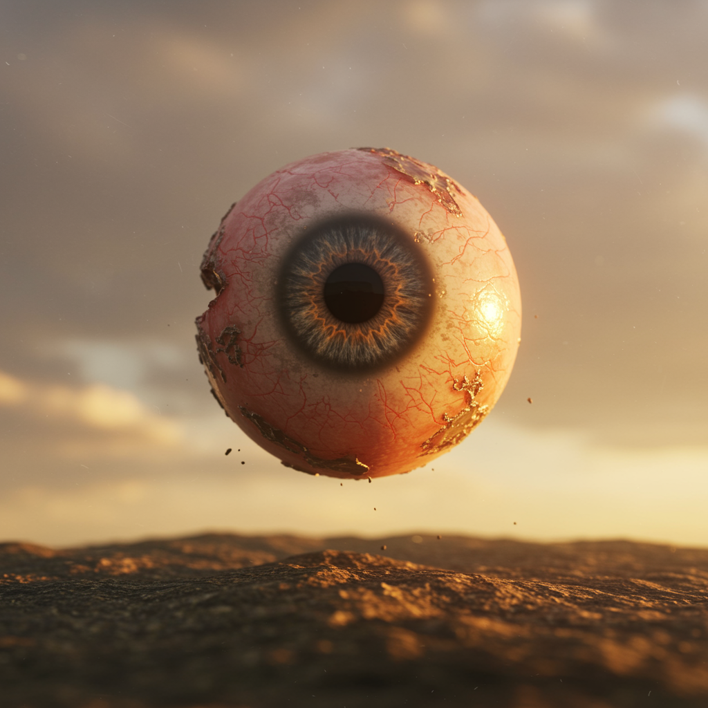 Ultra-realistic floating eyeball outside of head, illuminated by the soft glow of a pale sunrise, casting dramatic shadows. The scene is rendered in cinematic, hyper-realistic detail, reminiscent of a Studio Ghibli masterpiece combined with the intricate touches of John William Turner. The eyeball appears battered and weathered, yet its textures show extreme details under the warm morning light. Shot from a low angle, the composition gives a sense of grandeur, as if captured in Unreal Engine 5, making it a breathtaking piece that feels trending on ArtStation.