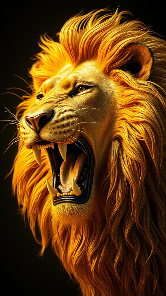 Ultra-realistic high-definition image of a lion's head mid-roar, coated in flowing molten gold, rendered using advanced 3D software similar to Octane and Unreal Engine, showcasing studio lighting that highlights intricate textures and fine details, 8k resolution, atmospheric shadows enhancing the fierce and majestic expression.