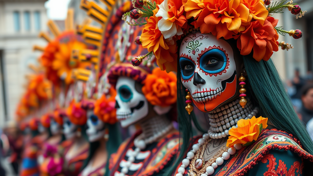 Ultra-realistic high-resolution photograph capturing the vibrant and lively Dia de los Muertos Parade in Mexico City, focusing on the intricate costumes and colorful makeup of participants. The image portrays the essence of the celebration, highlighting the detailed decorations and vibrant atmosphere with a touch of stylized artistic flair. The photograph should maintain a portrait orientation with an aspect ratio of 1:2, emphasizing the vertical splendor and grandeur of the parade.
