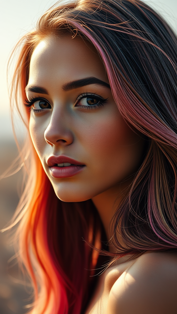 Ultra realistic, highly detailed, beautiful young woman, sun-kissed olive skin, strikingly detailed and captivating face, shoulder-length hair in vibrant shades of the rainbow, dramatic cinematic lighting, delicate light reflections, breathtaking photography, in a mesmerizing natural setting, Hyperrealism.