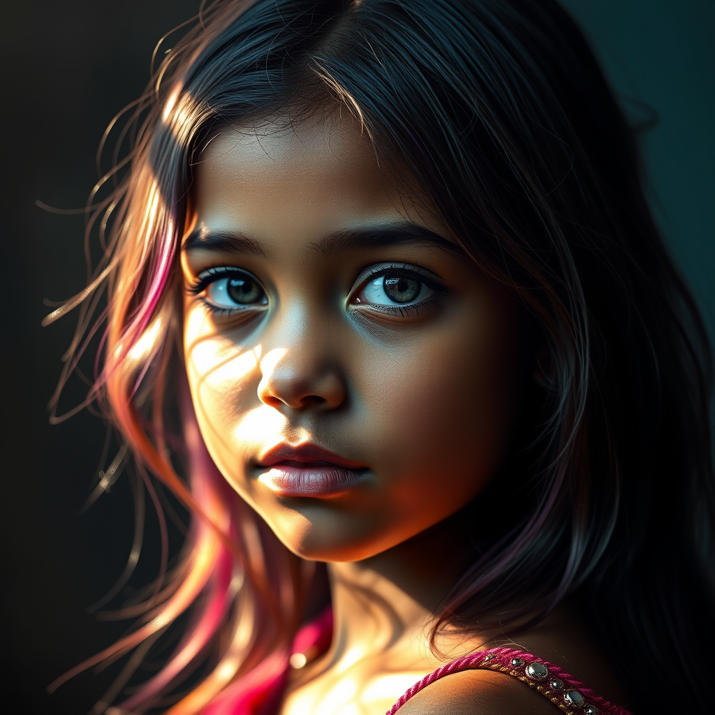 Ultra realistic, highly detailed portrait of a beautiful young girl with smooth olive skin and an intricately detailed, captivating face. Her medium-length hair shimmers with vibrant rainbow hues, capturing the light in a stunning display. The scene is bathed in cinematic lighting that casts dramatic shadows and luminous reflections, showcasing her in a breathtaking, hyper-realistic manner. The environment around her is equally stunning, adding depth and wonder to the composition, creating a visually striking image.