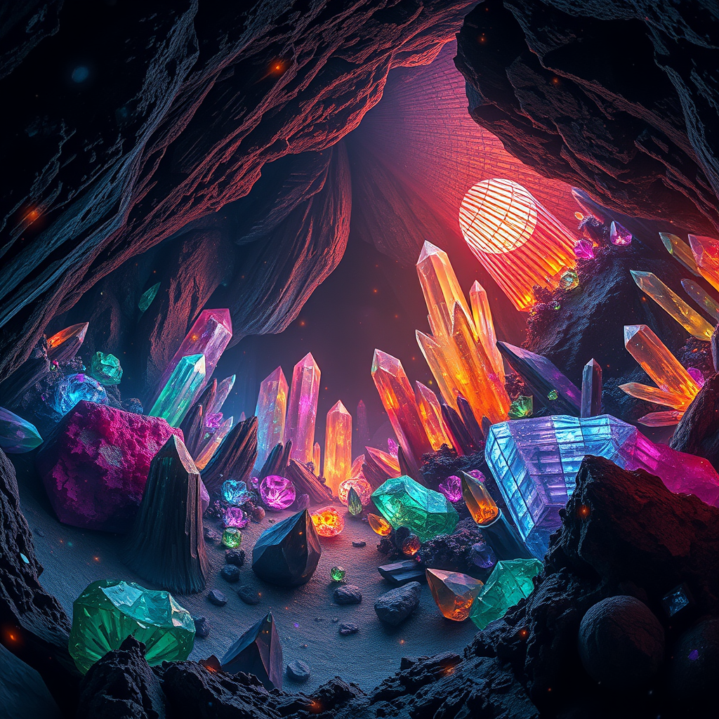 Ultra-realistic illustration and highly detailed digital render of a panoramic view in a shadowy underground cavern, abundant with gigantic, vibrant crystal formations reminiscent of works by Greg Rutkowski and Thomas Kinkade. The scene showcases colorful crystals and gems, meticulously detailed, vivid and alive with color, set against a backdrop of darkness dotted with mineral deposits. The atmosphere is cinematic, with high contrast and HDR quality that creates a magical and hyperrealistic feel. The crystals and geodes exhibit smooth textures, and the overall visual effect is enhanced by an artistic bokeh and depth of field. The scene is rendered in 4K using Unreal Engine, emphasizing its otherworldly beauty. Avoiding common artistic pitfalls, such as poor anatomy or proportions, extra or mutated limbs, and blurry details, the illustration ensures an immersive experience free from errors, focusing instead on the awe-inspiring splendor of the underground crystal cavern.