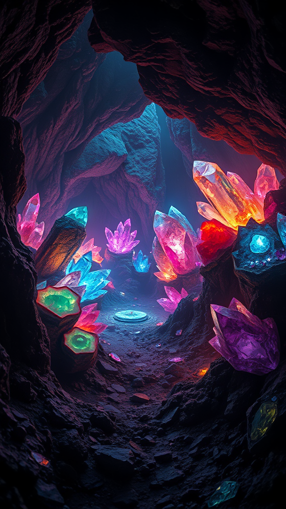 Ultra-realistic illustration of a panoramic view in a dark underground cavern rich in enormous colorful crystal deposits, inspired by the styles of Greg Rutkowski and Kinkade. The scene is vibrant and vivid, showcasing highly detailed, smooth surfaces of crystals, gems, and geodes amidst mineral deposits. It has a cinematic quality with high contrast and HDR-like effects, as if rendered in Unreal Engine. The magical, hyperrealistic setting features bokeh and depth of field effects, with an emphasis on the enchanting glow of the crystals. Despite being a low-resolution render, it maintains low distortion without artifacts, focusing purely on captivating and striking imagery within the boundaries of artistic portrayal.