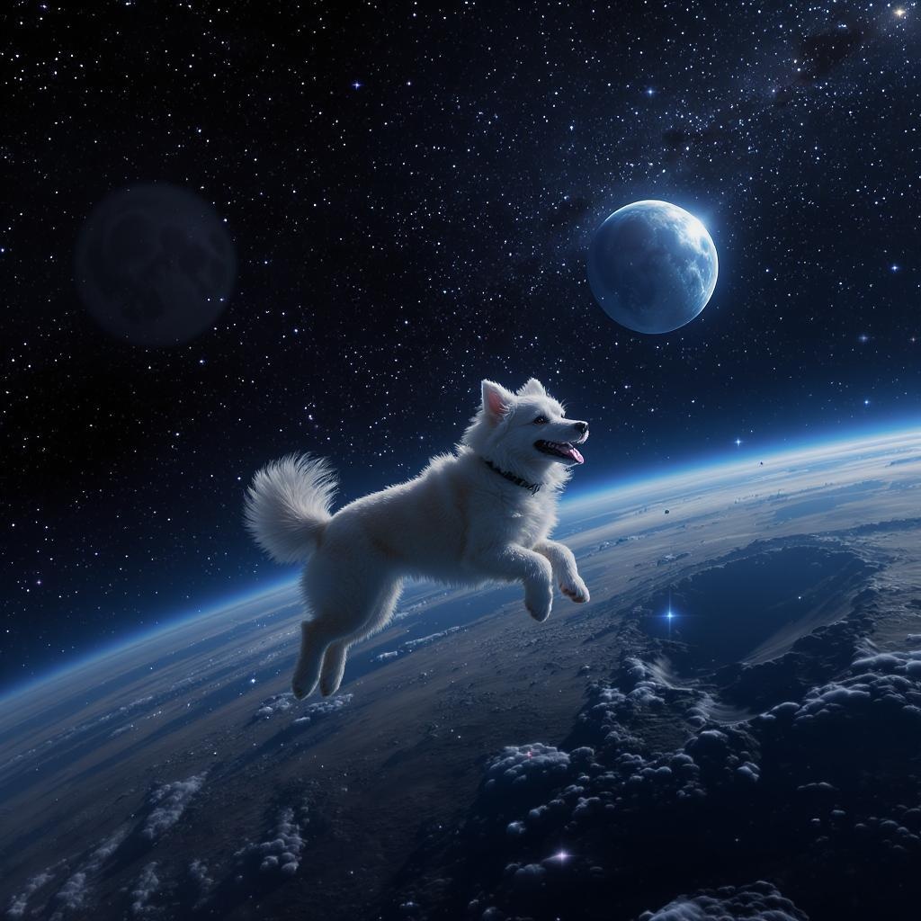 Ultra-realistic image of a furry dog floating gracefully in space, surrounded by the vast and serene beauty of the cosmos with the glowing lunar surface visible nearby, capturing the sense of freedom and adventure in stunning 4k detail.