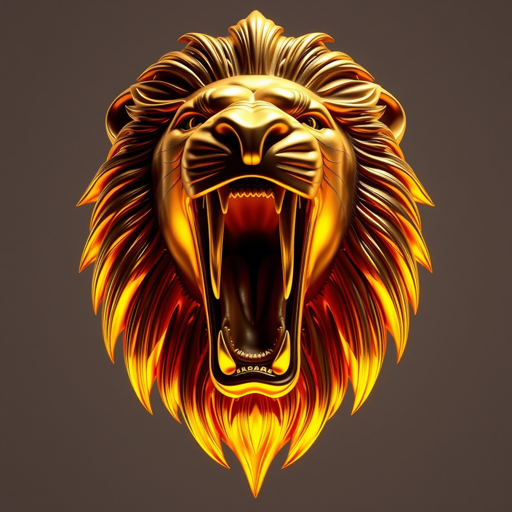 Ultra-realistic image of a lion's head roaring, glistening with molten gold, expertly rendered with 3D technology, showcasing studio-quality lighting and incredible detail, 8k resolution, hyper-detailed textures, dynamic reflections.