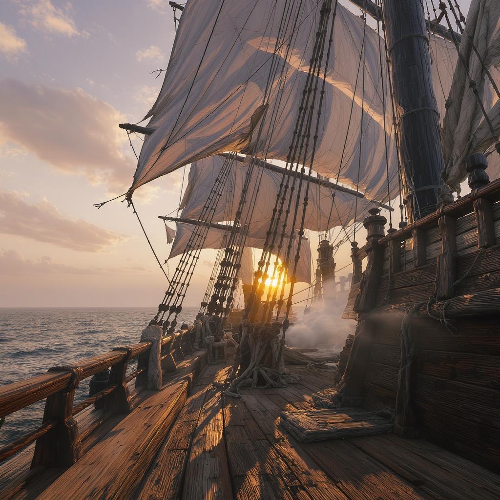 Ultra-realistic image of a majestic sailing ship with dramatic lighting, set against a pale sunrise, showcasing cinematic brilliance. The ship appears weathered and battered, captured from a low angle to emphasize its grandeur. Trending on ArtStation, this 4k masterpiece is hyper-realistic and focused, revealing extreme details reminiscent of Unreal Engine 5's capabilities. The scene is an intricate artwork, blending the magical essence of Studio Ghibli and the masterful touch of J.M.W. Turner, resulting in a captivating, cinematic masterpiece that invokes a sense of adventure and timeless beauty.