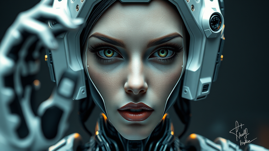 ultra-realistic image of a woman with robotic elements, digital 3d design, hard surface, real-time rendering, vfx elements, complex character design, highly detailed, trending style on art platforms, sharp focus in ultra-high definition, hdr, framing beyond edges, intentionally flawed art, soft focus, unconventional proportions, abstract signature, embedded text elements, artistic watermark