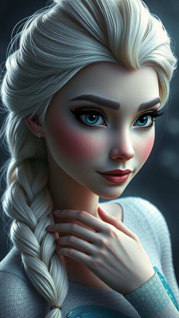 Ultra-realistic imagery of Elsa from Frozen featuring hyper-detailed textures and sharp focus, captured with the highest quality professional photography techniques. The composition includes hard and foreboding lighting with a dynamic angle, showcasing Elsa's perfectly sculpted full-body pose. Her skin displays highly detailed textures, and her face and eyes are beautifully intricate. The color palette consists of muted tones to enhance the realistic hyperrealism. This 16k UHD HDR photo emphasizes elegance and depth, capturing every nuance of her expression and form in a captivating, lifelike portrait.