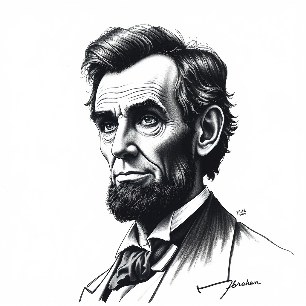 Ultra-realistic ink drawing, Abraham Lincoln, detailed portrait on a plain white backdrop, slight creative enhancements to highlight character depth and expression.