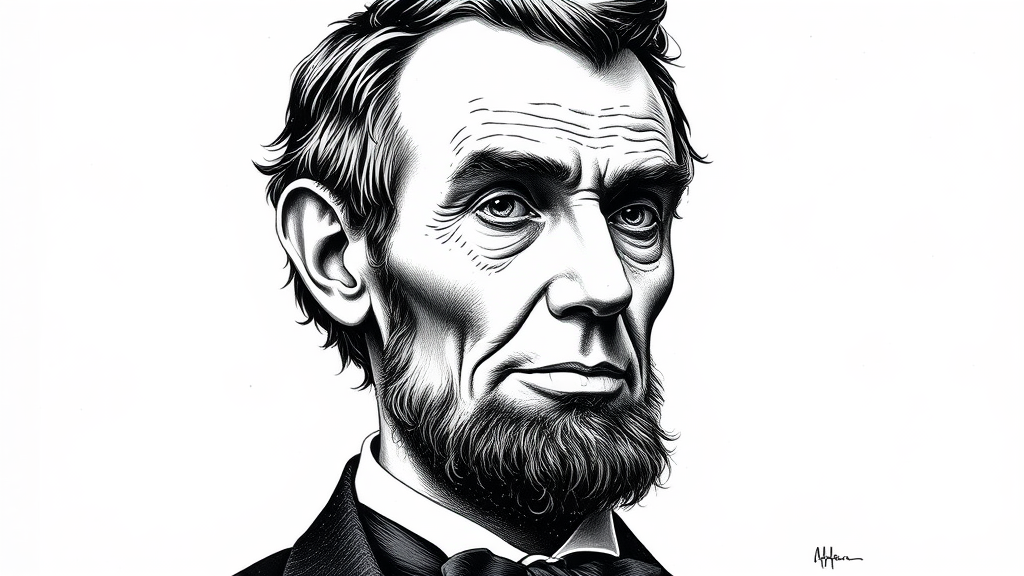 Ultra-realistic ink drawing of Abraham Lincoln, showcasing intricate details of his facial features, set against a clean white backdrop with subtle embellishments that hint at his historical significance.