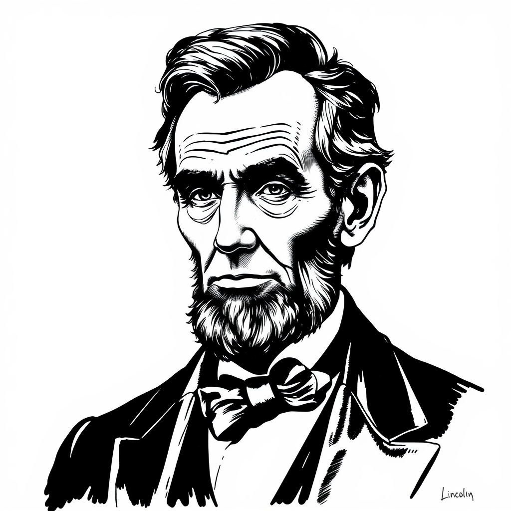 ultra-realistic ink illustration of Abraham Lincoln, detailed portrait on a clean white background, subtle creative elements added to emphasize character nuances