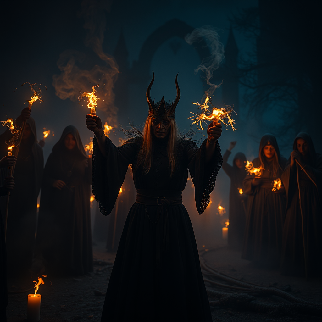 Ultra-realistic Motion Capture of Enchanting Spellcasting by a Vast Coven, Witchcraft, Mysterious Blocksberg as Backdrop, captured with Hasselblad H4D 200MS Digital Camera, Mitakon Speedmaster 300mm f/5.6 XCD lens, Dark and Moody Aesthetic, Glowing Ember Light, Complex Details, Light Pollution, Dramatic Illumination, Wide-Scale Magic --q 5 --ar 2:3