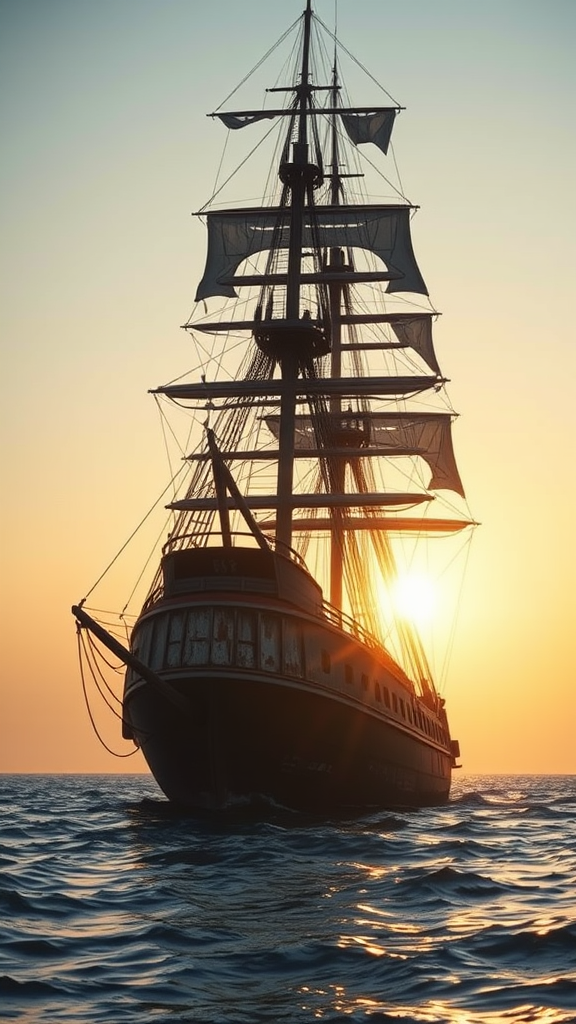 Ultra-realistic painting of a majestic sailing ship, illuminated by the soft glow of a pale sunrise. The dramatic lighting casts long shadows, highlighting the weathered textures of the ship's hull. Viewed from a low angle, the composition captures the grandeur of this battered vessel. Inspired by trending styles on ArtStation, the scene comes alive in 4k resolution with hyper-realistic focus and extreme details. Enhanced by Unreal Engine 5, the cinematic quality of the masterpiece is evident, blending the enchanting artistry of Studio Ghibli with the intricate brushwork reminiscent of John William Turner.