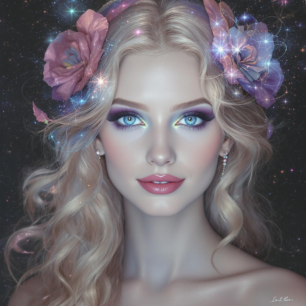 Ultra realistic photo portrait of Scarlett Leithold with ethereal cosmic energy, vibrant hues, and a mesmerizing burst of colors, showcasing her beautifully symmetrical face and a serene, kind expression. Her realistic, round eyes are captured in a tone-mapped finish, with intricate, elegant details. This digital painting embraces a dreamy, magical atmosphere with influences of Art Nouveau. It reflects inspiration from renowned artists like Artgerm, Greg Rutkowski, and Alphonse Mucha, resulting in a concept art piece with sharp focus and smooth, highly detailed illustration.