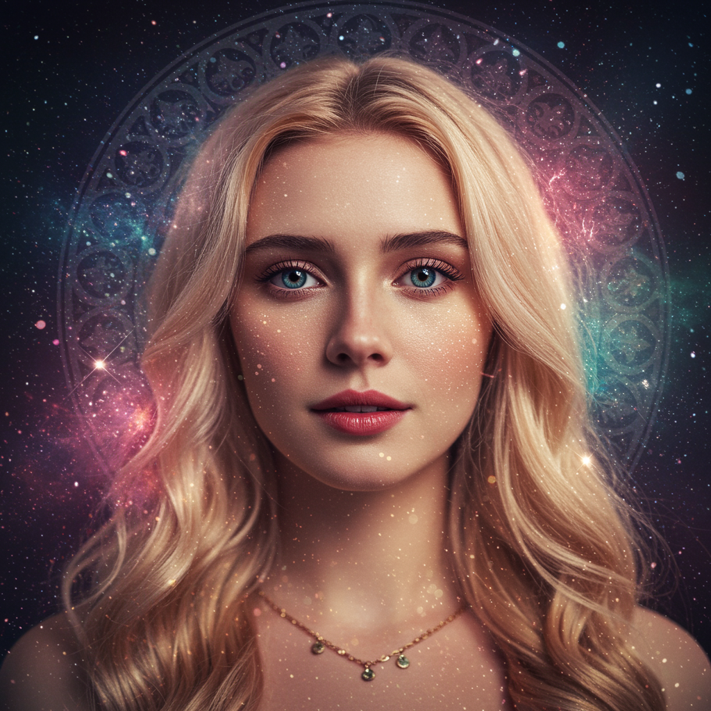 Ultra-realistic photo portrait of Scarlett Leithold surrounded by cosmic energy, vibrant colors bursting like a painting, with a beautifully symmetrical face and a serene, kind expression. Her realistic round eyes hold a gentle curiosity, exquisitely tone-mapped with an intricate and elegant touch. This highly detailed digital artwork blends the styles of ArtStation concept art with influences from Artgerm, Greg Rutkowski, and Alphonse Mucha, featuring a smooth and sharp focus that captures the dreamy, magical atmosphere. The scene is subtly accentuated with hues reminiscent of a starlit night, adding an ethereal quality to the illustration.