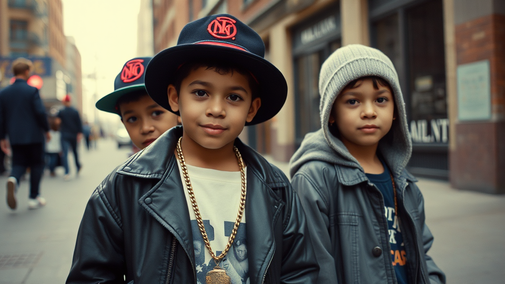 ultra realistic photograph children in gangster attire 50mm lens vintage film texture Kodak portra 800 lighting playful yet edgy urban backdrop