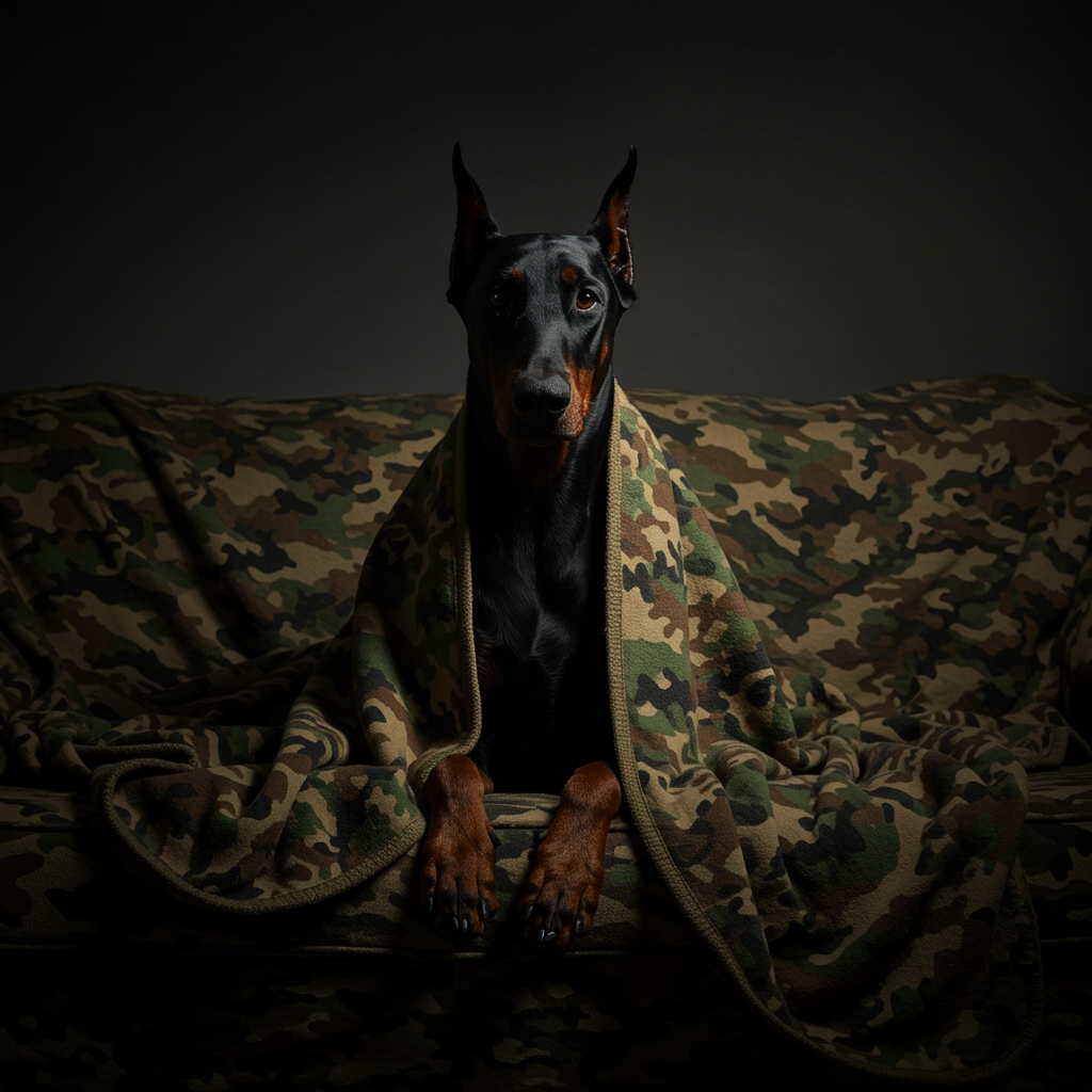 Ultra-realistic photograph featuring a minimalist studio setting with a black Doberman wrapped in a camouflage-patterned blanket. The dog is posed on a dark camouflage-textured sofa, its intense gaze locked onto the camera. The focus is on the intricate details of the blanket and the Doberman's sleek fur. Soft, dusky sunlight filters through, adding depth with gentle highlights and natural shadows. The overall scene is captured in UHD resolution, emphasizing every texture and nuance with a raw, unfiltered style and a touch of creative stylization in a 9:16 aspect ratio.
