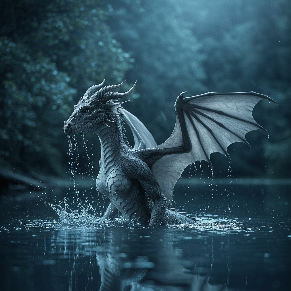 Ultra realistic photograph of a breathtaking anthropomorphic female dragon gracefully emerging from a serene lake under the moonlight, her scales glistening in the soft, silver-blue glow. The composition captures a moment of sublime beauty that evokes admiration, with water droplets cascading elegantly from her sinuous form and delicate wings half-unfurled, creating ripples that shimmer around her. Her eyes gaze intently, conveying wisdom and depth, while the surrounding lush forest reflects a pristine clarity, enhancing the hyper-realistic, hyper-detailed effect in stunning 32k UHD resolution.