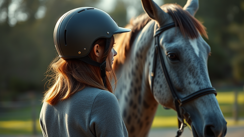 Ultra-realistic photograph of a contemporary young woman with chestnut hair, preparing to ride a dappled gray horse. She faces away, her helmet secured, embodying the anticipation of a serene ride. Captured in side profile under the gentle, natural light of 2023, this ultra-detailed scene is shot with a Leica 50mm lens, using Kodak Portra 800 film. The image is artfully composed with elements of chiaroscuro, shot at f1.4, emphasizing the subtle play of light and shadow, highlighting the contours of both rider and horse.