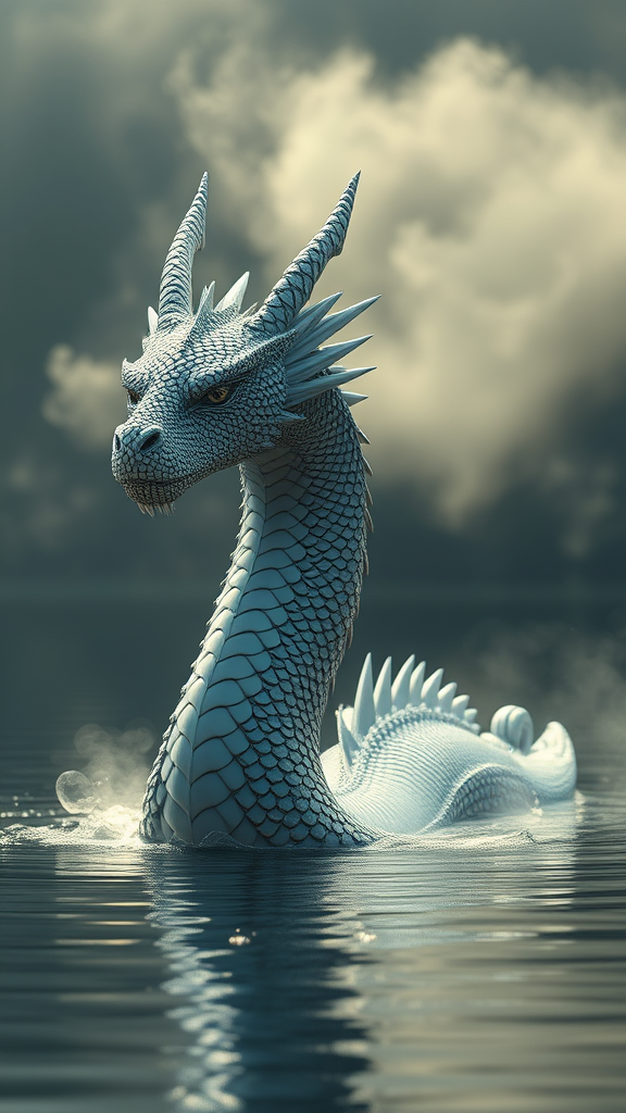 ultra-realistic photograph of a mesmerizing anthropomorphic female dragon gracefully emerging from a tranquil lake, intricate scales glistening under the gentle play of sunlight, ethereal mist rising around to add an air of mystery, exquisite and finely detailed facial features conveying a sense of wisdom and allure, the serene waters reflecting her magnificent form, overall composition capturing the awe-inspiring beauty of mythical elegance, 32k UHD resolution.