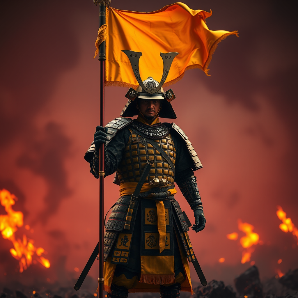 Ultra-realistic photograph of a samurai warrior standing tall, showcasing intricate yellow and black armor with elaborate details, all set against a backdrop of a reddish, war-torn environment filled with smoke and glowing embers. The samurai holds a vivid yellow war flag banner, embodying a sense of honor and strength. The scene is illuminated with ornate, cinematic lighting that highlights the high-definition detail and depth of field, achieving a vibrant, hyperrealistic quality. Reflections and shadows are skillfully rendered, enhanced by unreal engine 5's advanced capabilities, giving the impression of a legendary figure emerging from history. The mood is dark and intense, with lumen reflections adding layers of depth and drama, making it a trending masterpiece on art platforms, especially designed in a 9:16 aspect ratio for striking visual impact.
