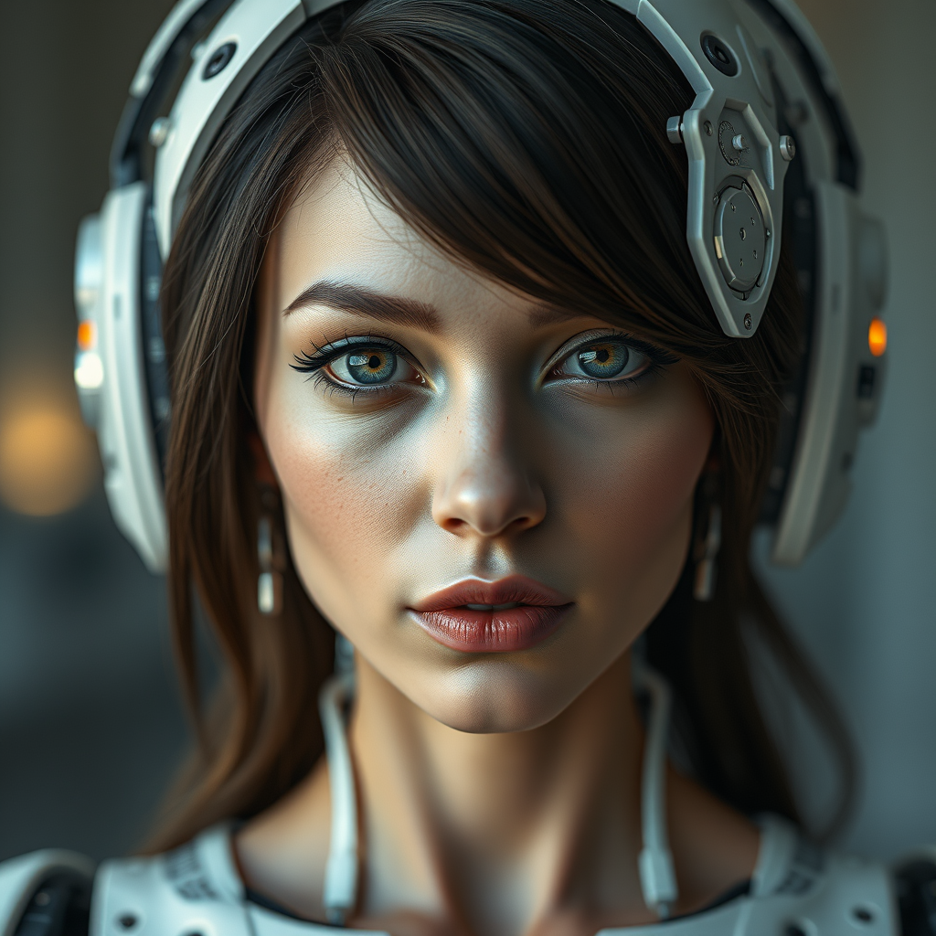 Ultra-realistic photograph of a woman blended with robotic components, featuring digital 3D rendering and hard surface design. The image showcases intricate character features with cutting-edge VFX effects, capturing a highly detailed and sharp focus aesthetic. Trending on ArtStation, the composition is rendered in UHD and HDR, with parts partially out of frame. Intentionally offbeat artistic elements create a sense of imperfection: slight blurriness and unconventional proportions. Unintentionally includes a signature, vague words, abstract descriptions, and a discreet watermark.
