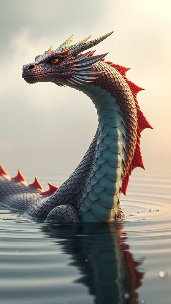 Ultra-realistic photograph of an enchanting anthropomorphic female dragon gracefully emerging from a serene lake, her scales glistening with droplets, surrounded by the gentle embrace of morning mist. The composition captures her stunning elegance, evoking a profound sense of admiration. The hyper-detailed scene unfolds in a breathtaking 32k UHD resolution, with the dragon's expressive eyes and intricate scales captivating the viewer, as the soft interplay of light and water creates an ethereal atmosphere.