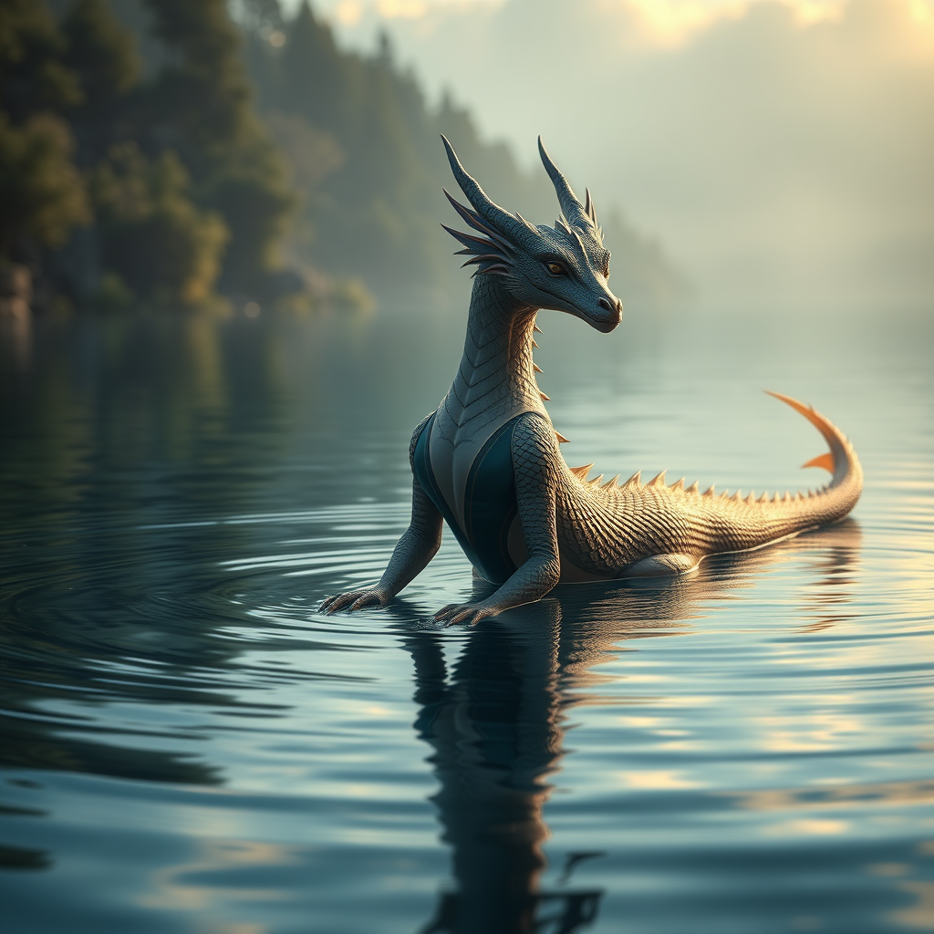 Ultra realistic photograph of an exquisite anthropomorphic femdragon, captivating and elegant, wearing a sleek swimsuit, gracefully floating on the tranquil lake surface, composition evokes a profound sense of wonder, hyper realistic with striking detail, deeply emotional, grand cinematic lighting, captured in 32k UHD resolution with Hasselblad H6D 400c Multi-Shot, using Mitakon Speedmaster 35mm f/1.2 XCD lens, showcasing expressive style, aspect ratio 1:2, enhanced anime flair, Niji 5 quality, with a touch of artistic flair to add a unique twist while preserving the essence of the original concept.